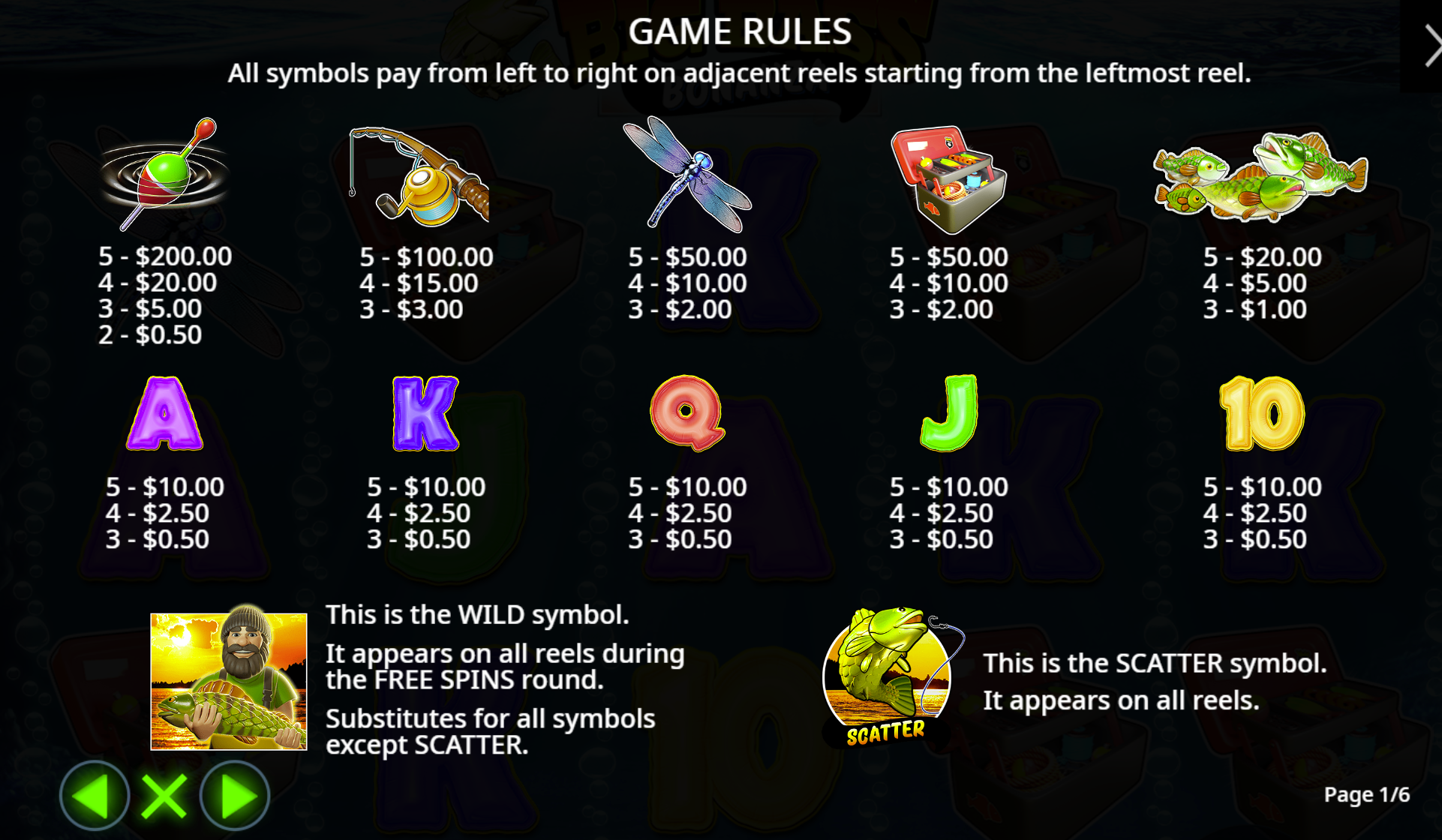 • Casting Wilds Feature: Random base game feature where the fisherman throws wilds onto the reels.