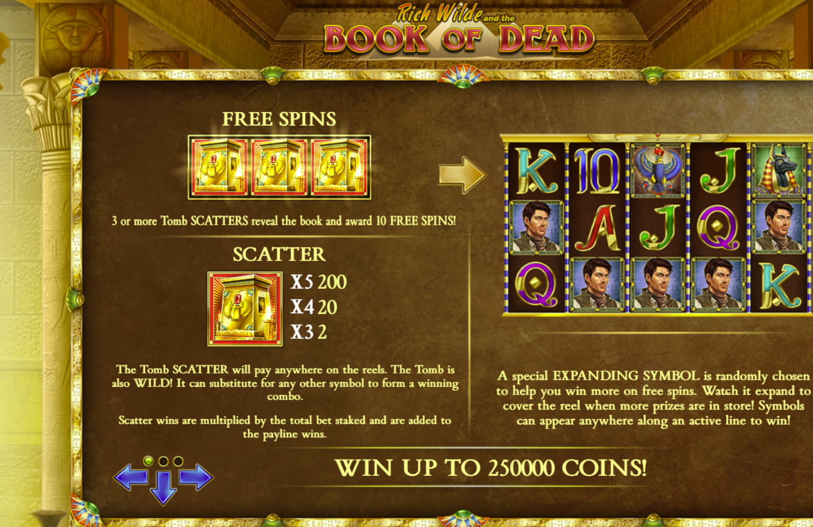 - Free Spins Feature: Land three or more Book scatter symbols to trigger 10 free spins with a special expanding symbol.